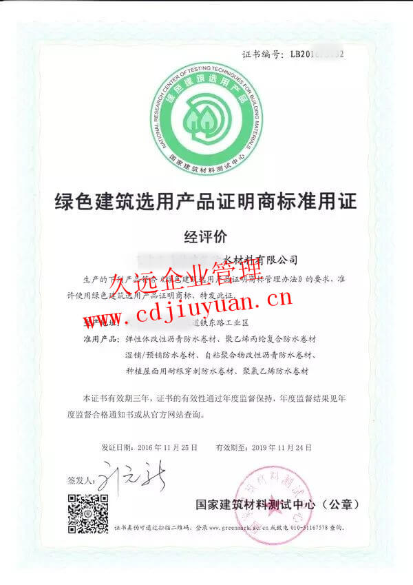 綠色建筑選用產(chǎn)品認證證書